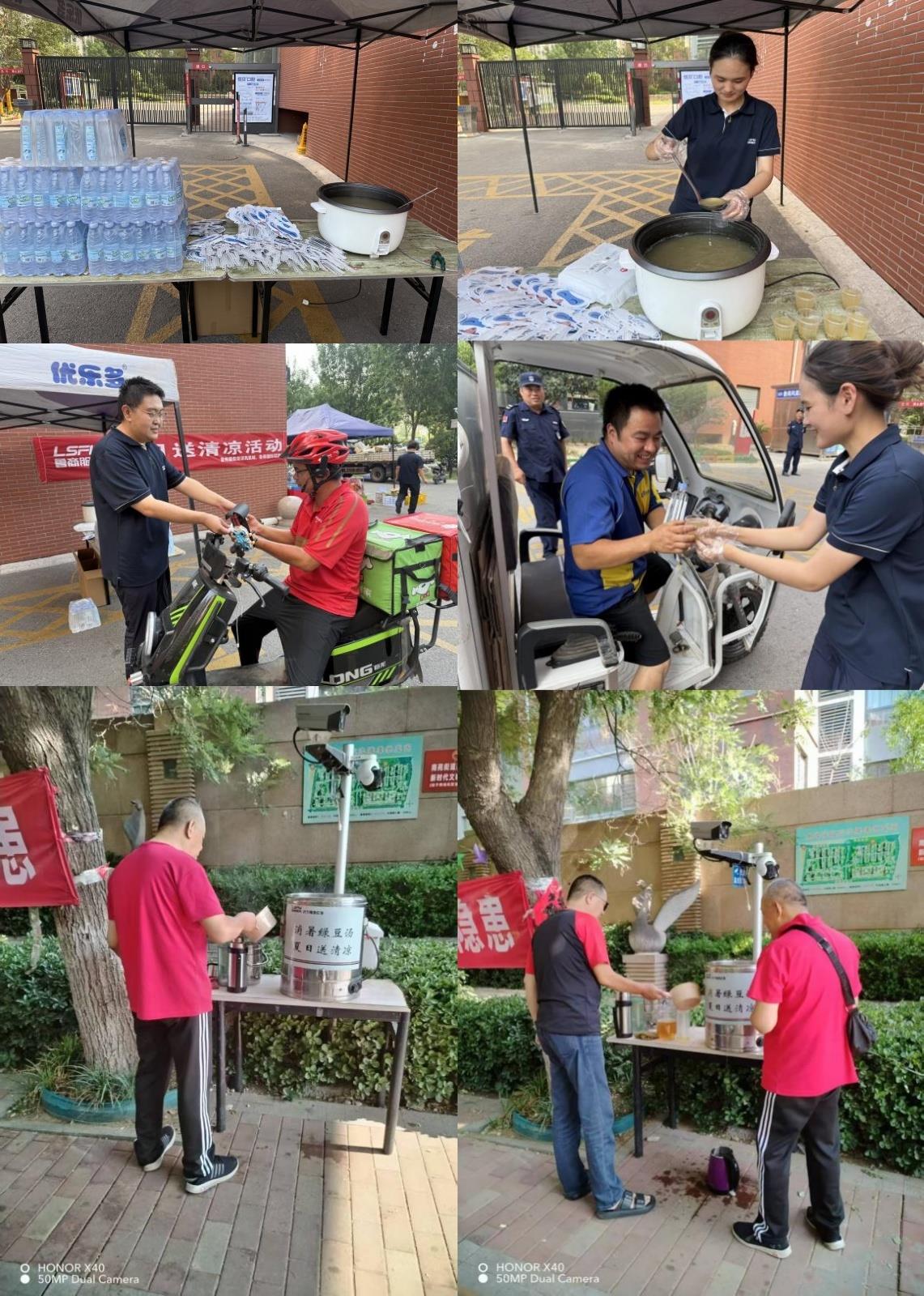 菏澤鳳凰城和濟寧南池公館的工作人員為業主、快遞員和外賣小哥送上貼心關懷——一把把印著溫馨提示的扇子驅散燥熱,一瓶瓶冰鎮礦泉水解渴降溫,一碗碗精心熬制的綠豆湯清甜解暑。接過清涼的瞬間,笑容在每個人臉上綻放。這份夏日里的惦念,是魯商服務對業主的暖心守護,也是對戶外工作者的真誠致敬。