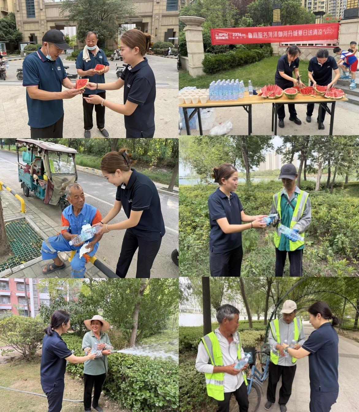 魯商服務各項目還特別關注環衛工人群體,菏澤鳳凰城和御河丹城項目在小區門口組織專人將解暑西瓜、礦泉水送到一線,為環衛工人遞上冰鎮瓶裝水,還細心將新鮮西瓜切塊分裝,讓大家在高溫中能歇腳解渴。環衛工李師傅感動地說:“這么熱的天能吃上西瓜,心里是真涼爽!”
